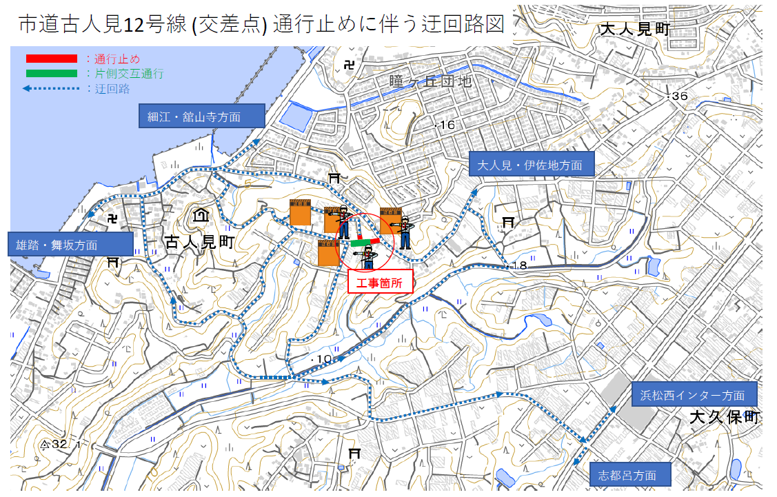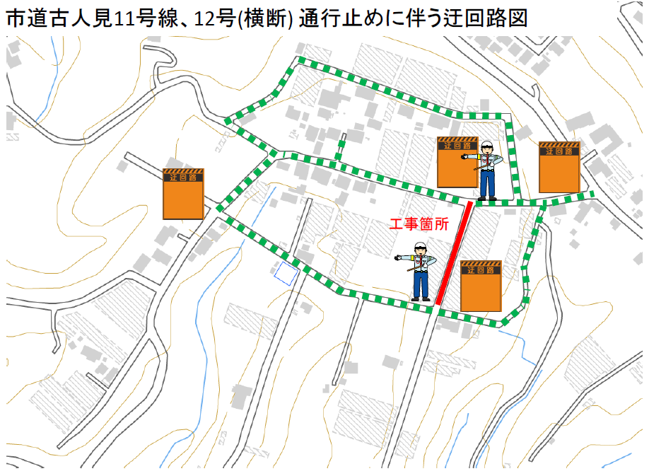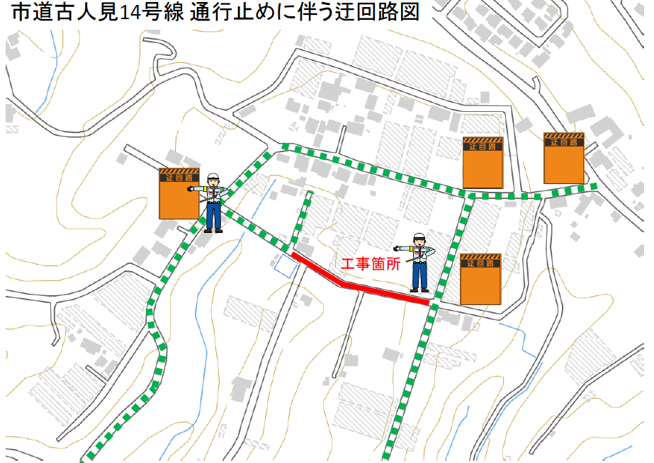 市道古人見14号線の工事を行っている時の迂回路図です。